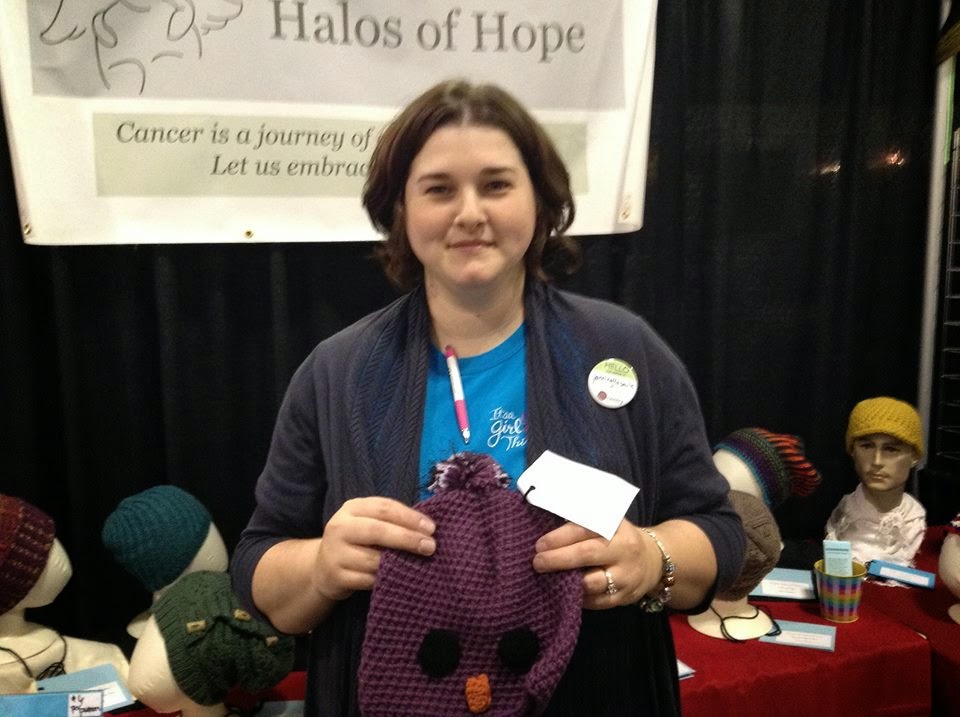 I also completed a donation hat for Halos of Hope again. This was my 2nd time to donate to them. You can see the first set I donated here along with the link to the pattern I used. This time I was inspired by a hat from Laura Brown called the spring chicken hat. This is a cute free pattern found on Ravelry. I added a Pom Pom on top and since Halos was collecting hats in a Safari Theme I choose the Violet – Backed Starling as my inspiration. I used Hobby Lobby’s I Love This Yarn in Mulberry and some scraps for the eyes and beak. I was able to drop off my hat at Stitches South in Atlanta.