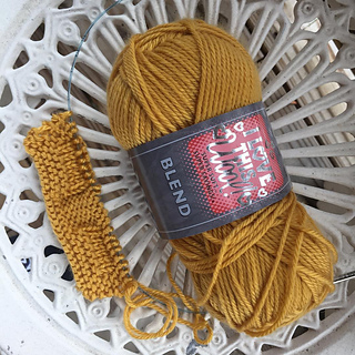 I used I Love This Wool from Hobby Lobby. It is a wool blend with 80% acrylic and 20% wool. I was able to get about 6 square from each color. I am using color 105 in charcoal and color 140 Mustard. I have all the grey done I just need to weave in ends and block. I have about 4 mustard done as well.
